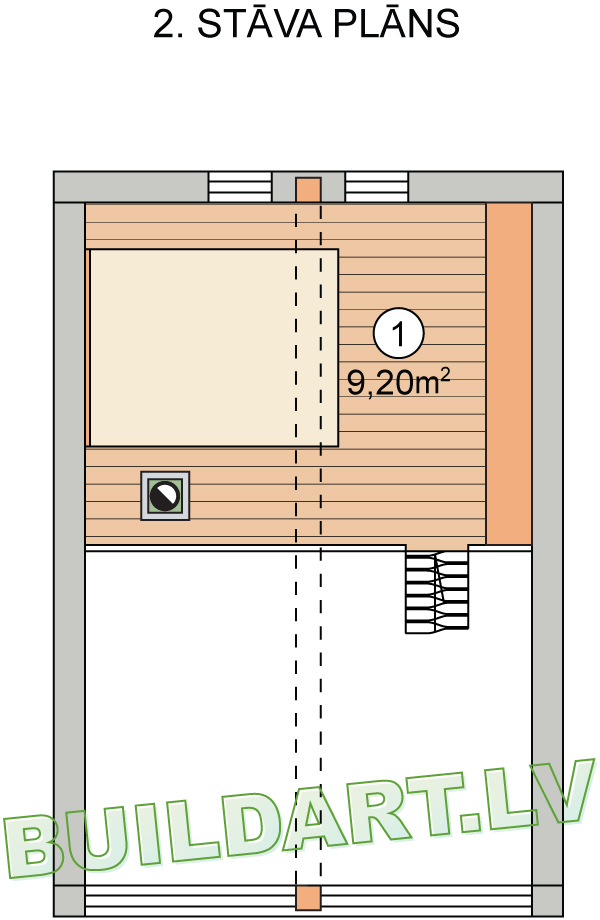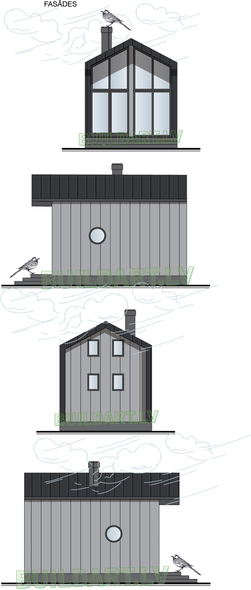 Šī ir viegli uzbūvējama, vienkārša un neliela pirtiņa, ar ērtām atpūtas telpām, ar augstiem griestiem un lielu stiklojumu kā arī platību otrajā stāvā ērtai atpūtai vai pirts slotu žāvēšanai. Ēkas fasādēs iespējams koka dēļu vai skārda apšuvums, jumts – skārda Classic segums, ēkas stiklotajā dienvidu fasādē – palielināta jumta pārkare un segta terasīte zem tās. Fasādes minimālistiskā stilā, bez jumta pārkarēm. Ir funkcionāla pirts karsētava ar ģērbtuvi, dušu un wc. Atpūtas telpā – neliela virtuves lete, ērtai saimniekošanai, vieta atpūtas mēbelēm, ieejas durvju tuvumā – virsdrēbju novietne.